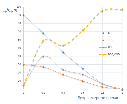 При этом нет необходимости производить полную деструкцию органических примесей в воде. Достаточно получить значение отношения БПК/ХПК, при котором начинает эффективно работать биологическая очистка. Как правило это происходит, когда соотношение БПК/ХПК более 0,4-0,6.