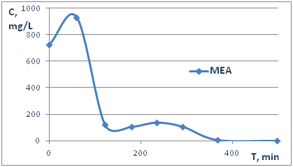 - Проведены экспериментальные работы на стендовой установке по разложению этаноламина на модельных растворах для условий заказчика. Получены степени разложения этаноламина в модельных растворах на уровне 99,85% от начальной концентрации 0,95 мг/дм3 до 1,3 мг/дм3.